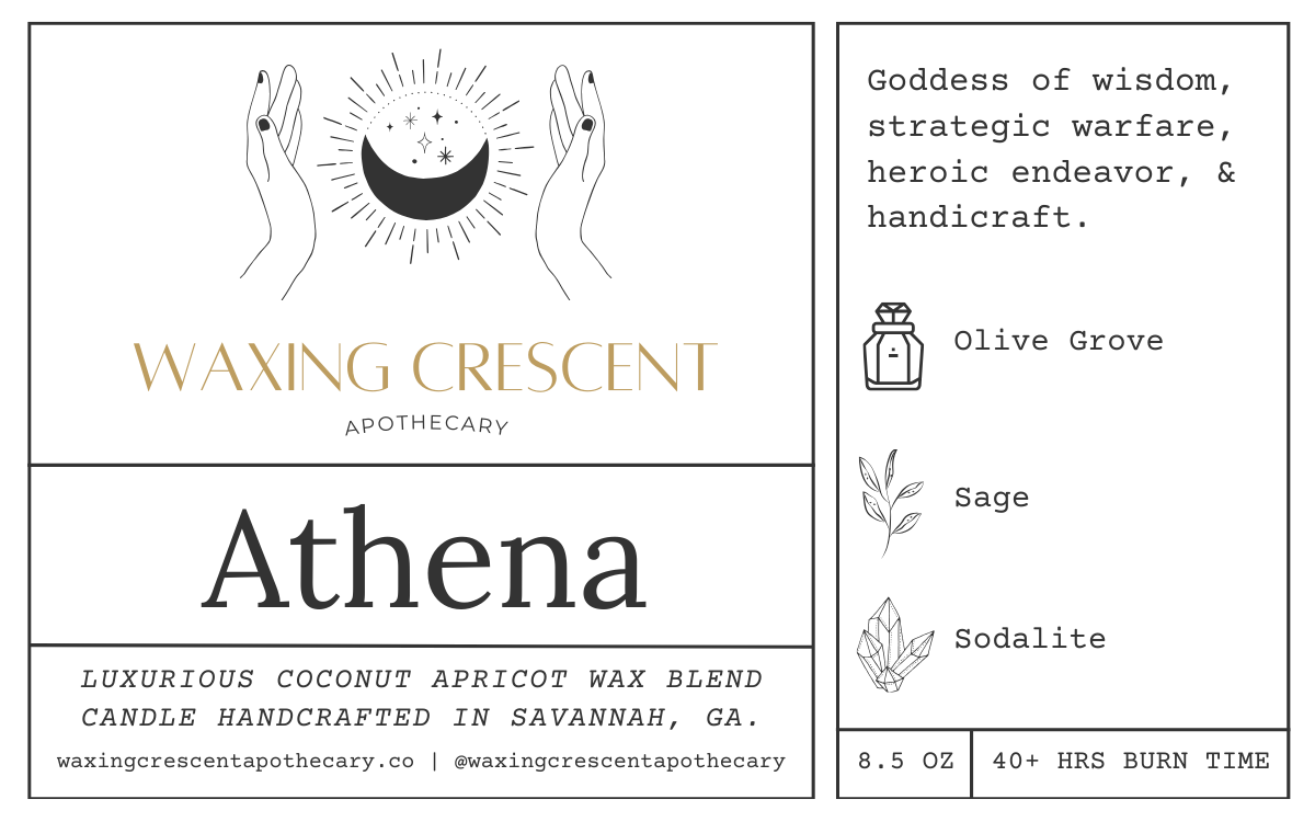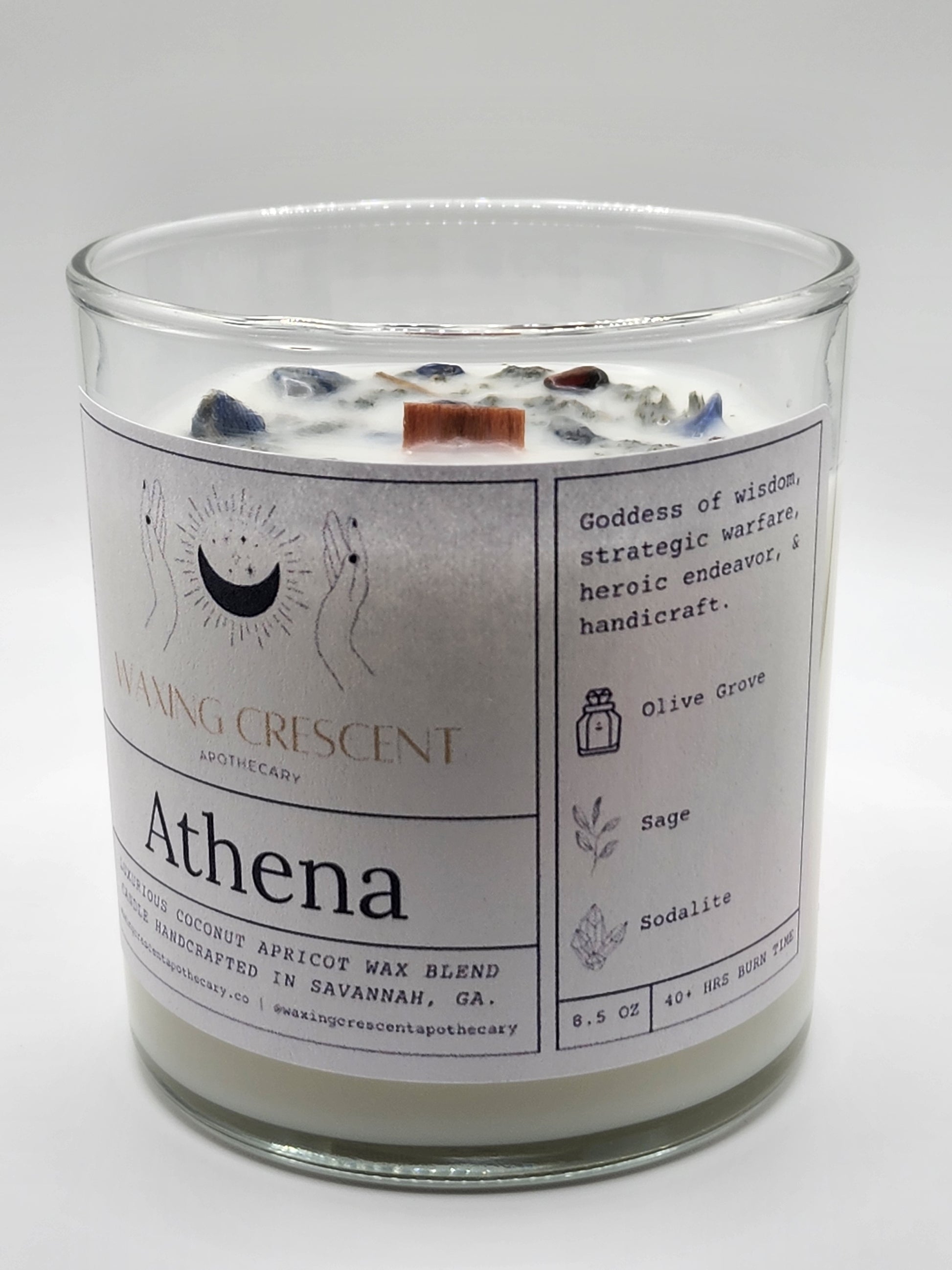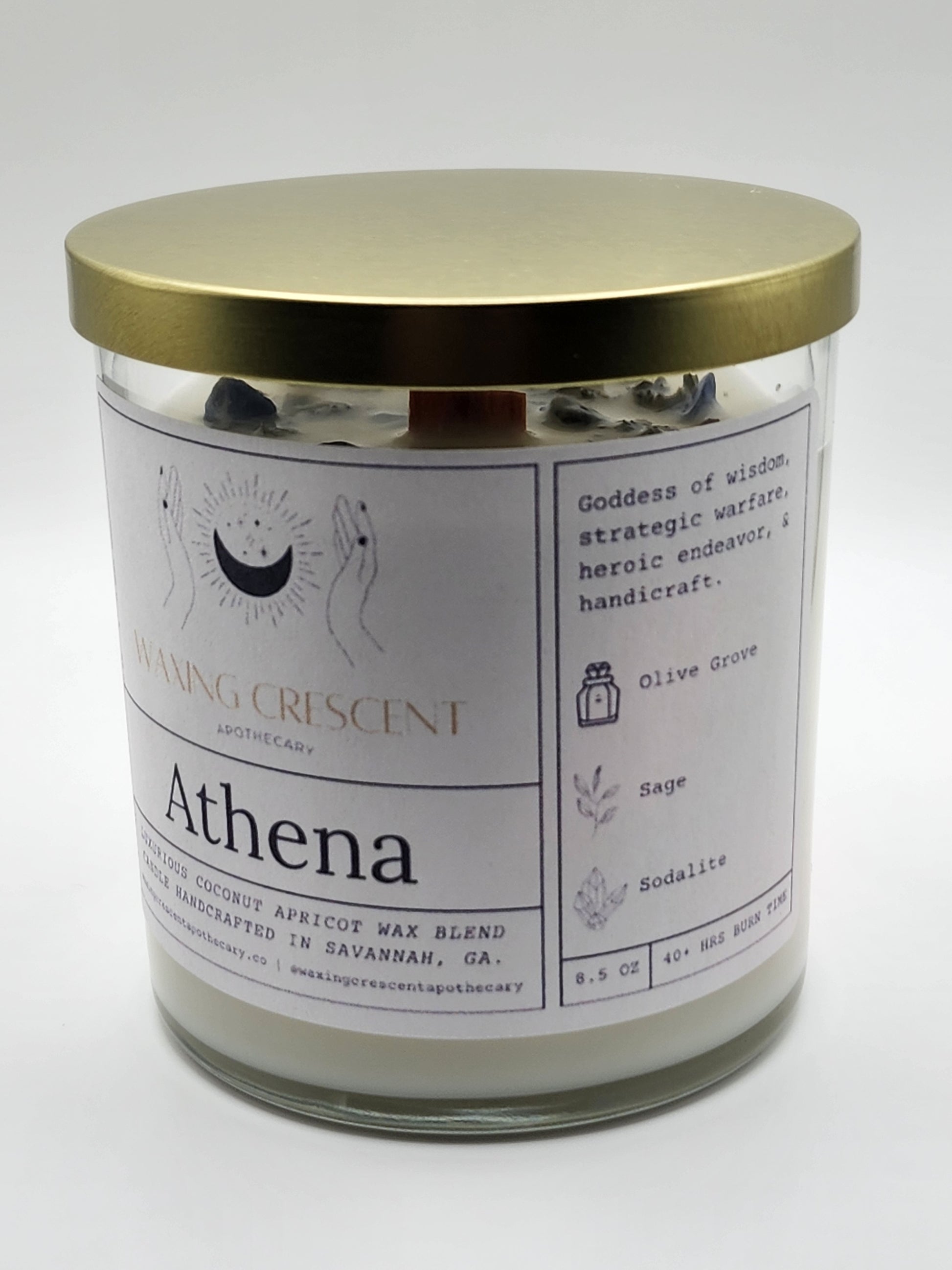 The first olive tree was gifted by Athena to the city of Athens in a competition for their favor between herself and the god Poseidon. The Athenians chose her gift over Poseidon's, and the olive tree came to represent peace, wisdom, and prosperity. This fresh, citrus and olive grove scent perfectly symbolizes the wisdom and clarity of Athena. The sprinkle of sage also reinforces that sense of wisdom and clarity, while sodalite promotes inner peace, intuition, and clear communication.