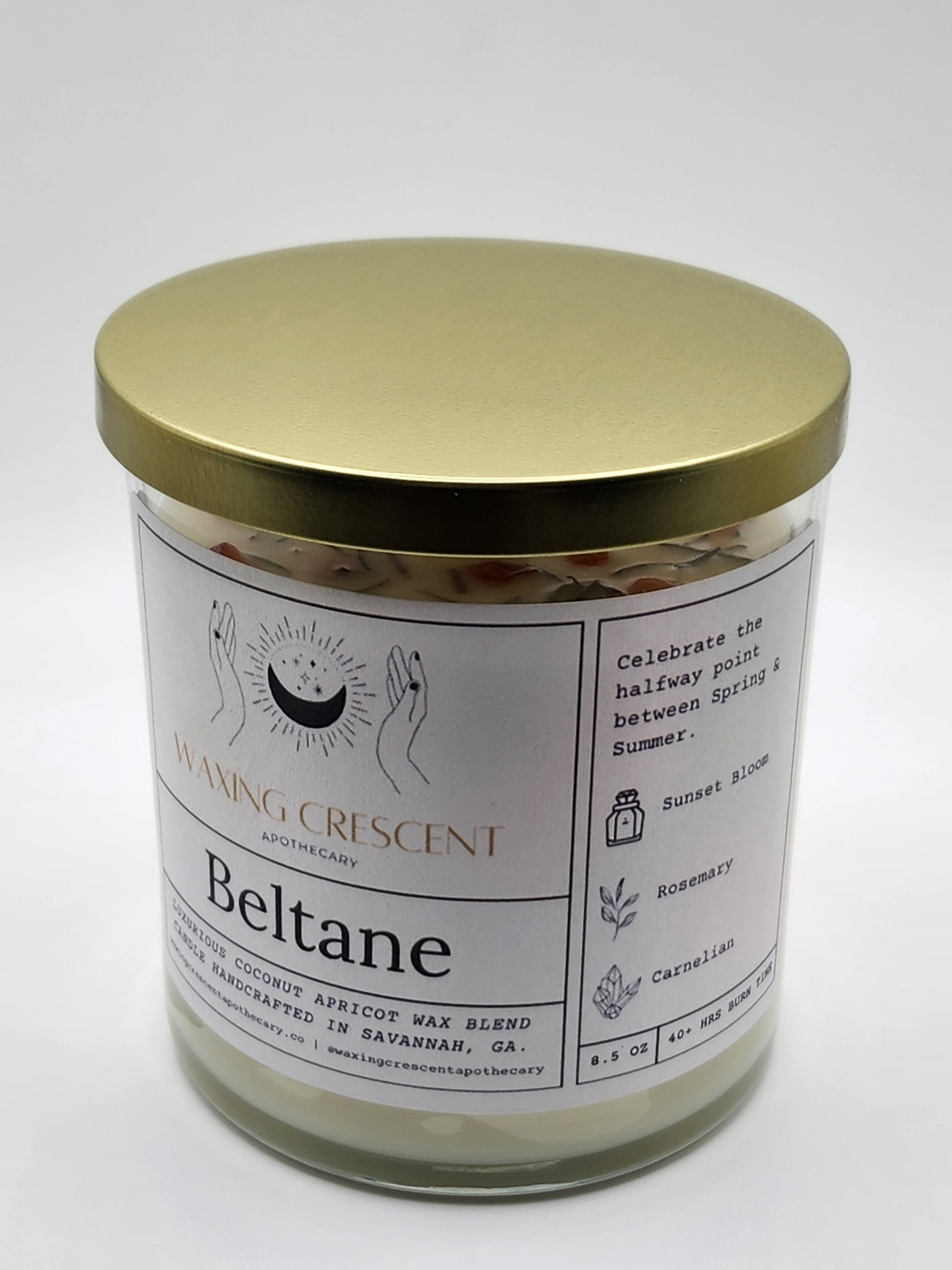 This fragrance blends fresh spring blossoms and tangerine with elements of sea salt, creamy vanilla, and sun-weathered cedar for an uplifting and energizing experience. The sprinkle of rosemary and carnelian also promotes energy and fire, making this the perfect combination for celebrating Beltane.