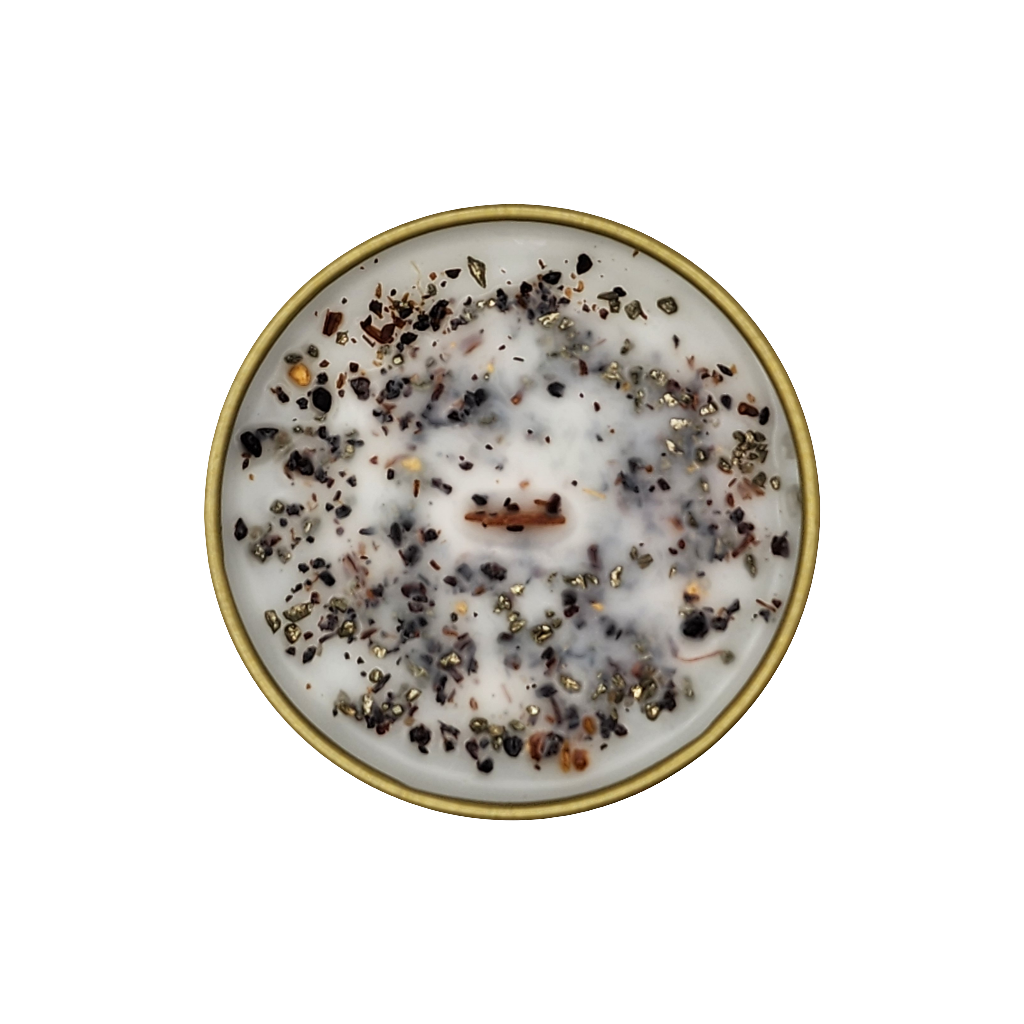 Among her many attributes, Brigid, the Keeper of the Flame, is the Celtic Goddess of healing, poetry, and smithcraft. She brings the fire of inspiration, transformation, and protection to all areas of her influence. The lemon verbena scent of this candle invokes her spirit of healing and protection, and stimulates a clear mind and creativity. The sprinkle of dandelion, a symbol of Brigid, doubles down on the healing and protection, while pyrite adds a spark of fire and transformative energy.