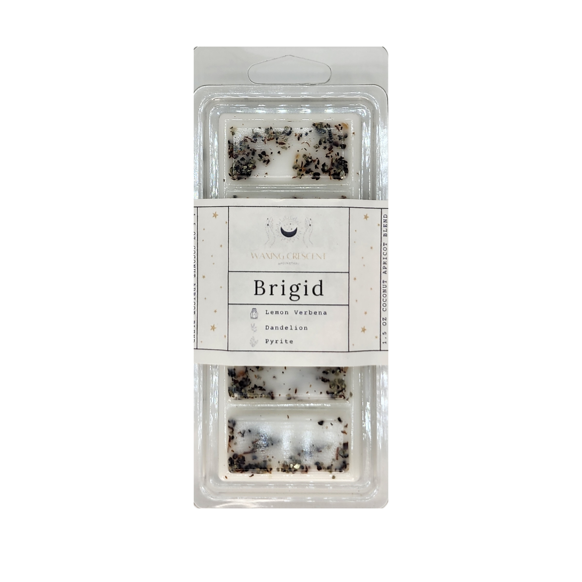 Among her many attributes, Brigid, the Keeper of the Flame, is the Celtic Goddess of healing, poetry, and smithcraft. She brings the fire of inspiration, transformation, and protection to all areas of her influence. The lemon verbena scent of this wax melt invokes her spirit of healing and protection, and stimulates a clear mind and creativity. The sprinkle of dandelion, a symbol of Brigid, doubles down on the healing and protection, while pyrite adds a spark of fire and transformative energy.