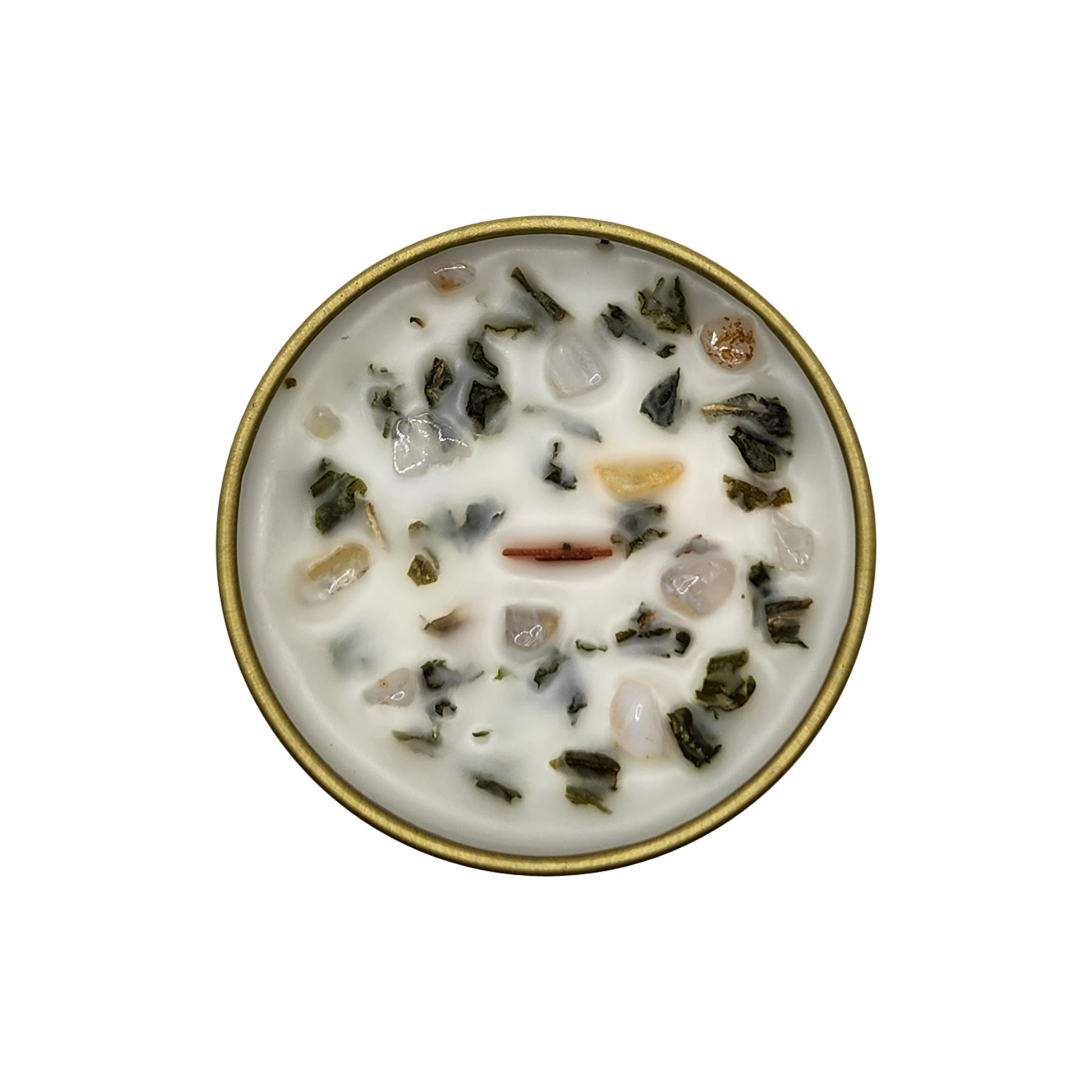 Each candle is crowned with a sprinkle of basil for good fortune, clarity, and harmonious relationships, and aventurine to encourage spiritual growth, emotional well-being, and the weaving of positive connections.