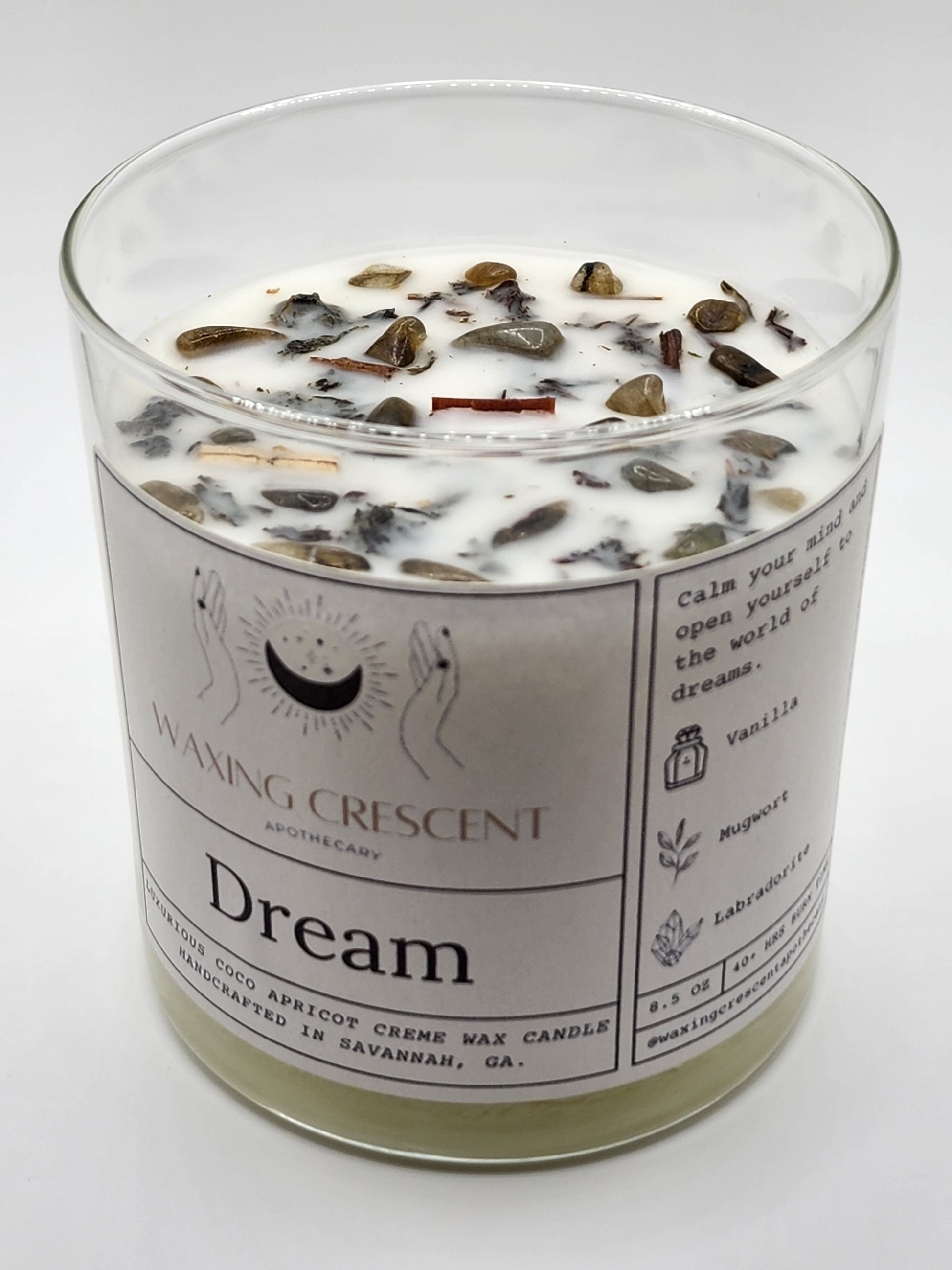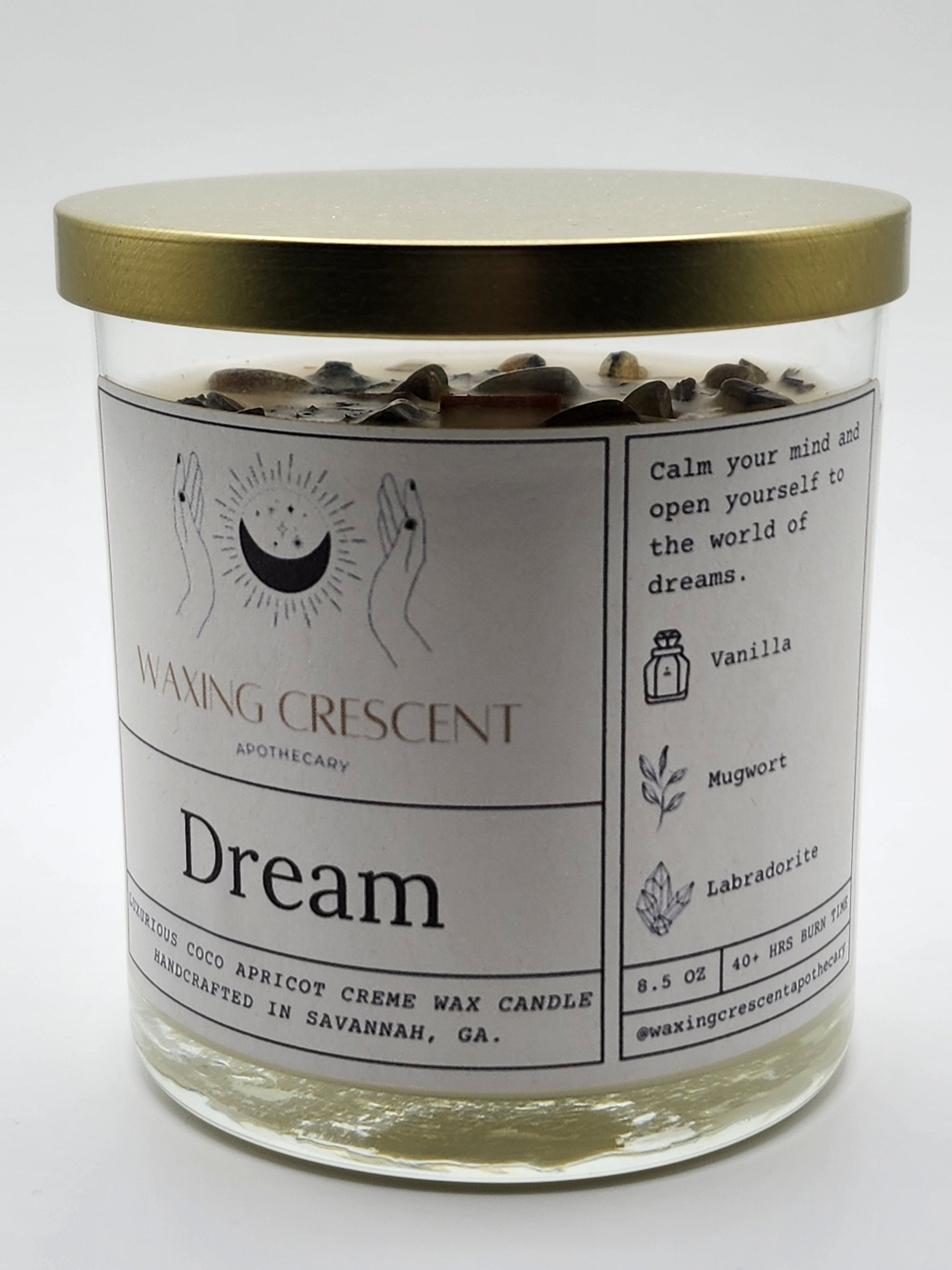 This perfectly delicious vanilla scent will calm your mind and prepare you for those sweet, sweet dreams. Mugwort has calming properties to aid in better sleep and lucid dreaming. Labradorite also imbues positive energy and protection, while enhancing dreams and helping to process them upon waking.