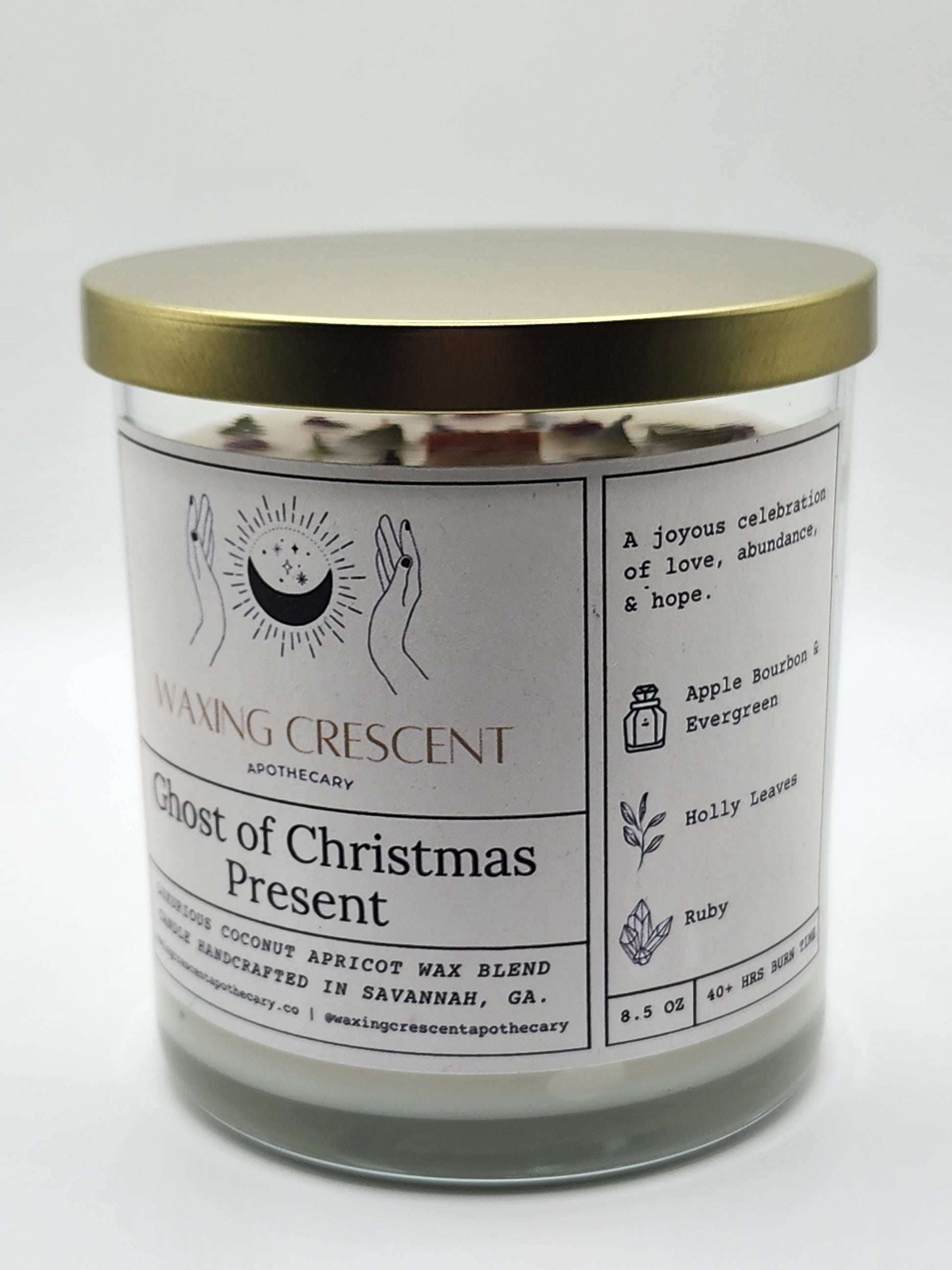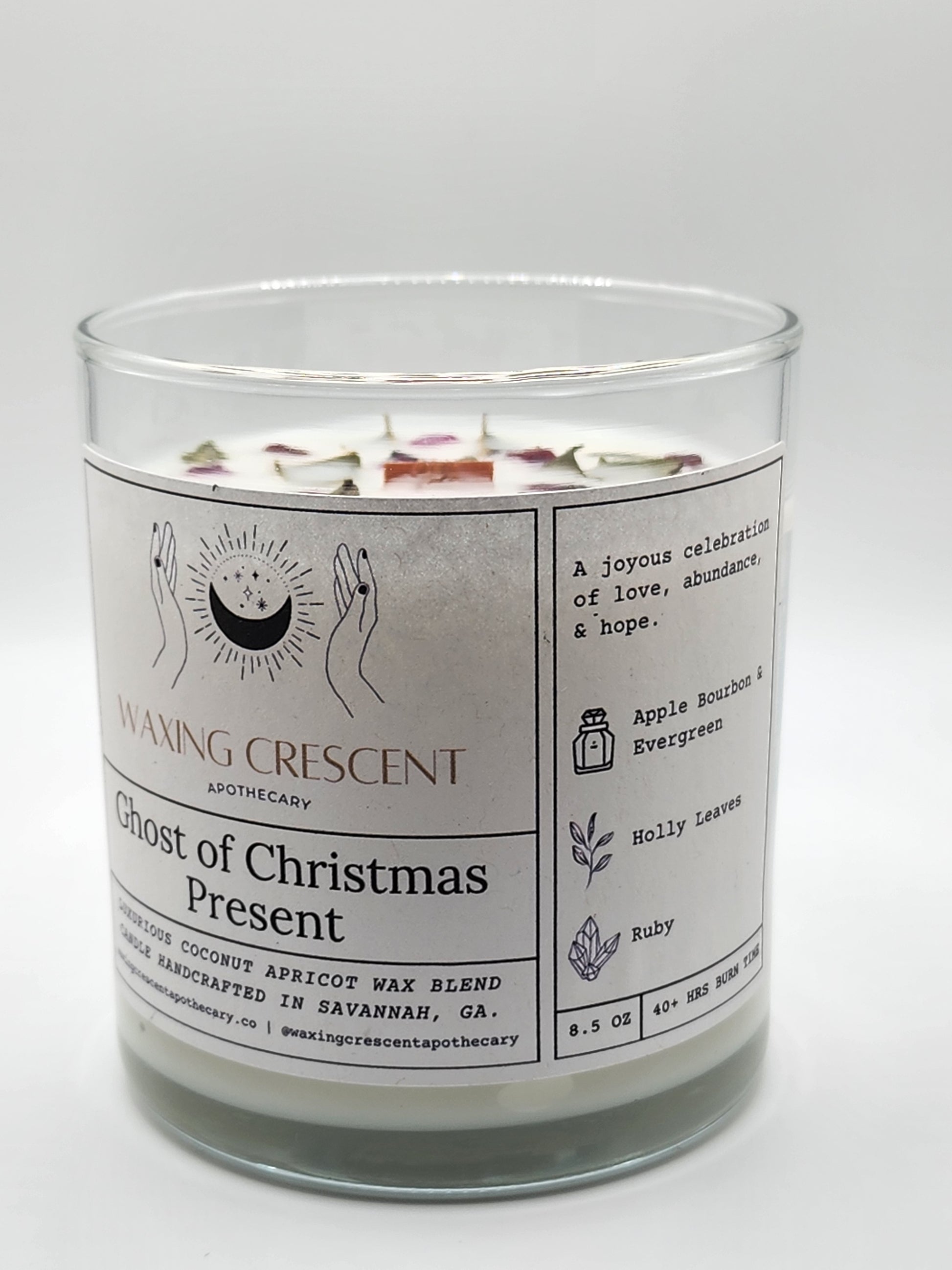 Inspired by the merry giant who guides Scrooge through scenes of love and celebration, Ghost of Christmas Present will fill your space with the scents of a Christmas overflowing with joy. Bright notes of apple, orange, mandarin, and cranberry evoke a festive Victorian table piled high with fruit, while cheerful cinnamon, vanilla, maple, butter, coconut, and a touch of bourbon wrap the room in the cozy sweetness of holiday treats. Fir, juniper, and cedar weave through the blend like fresh garlands hung for the season.