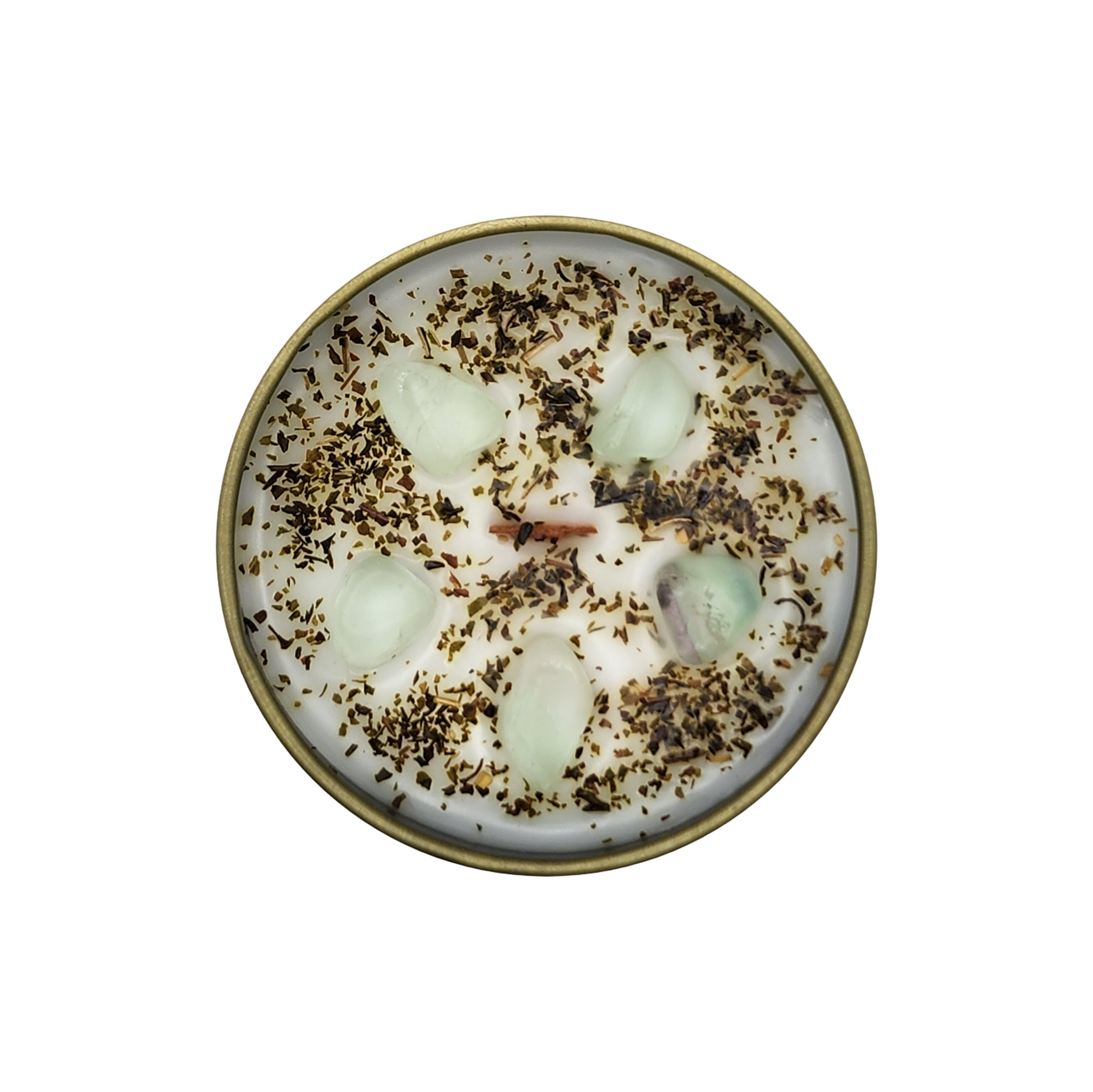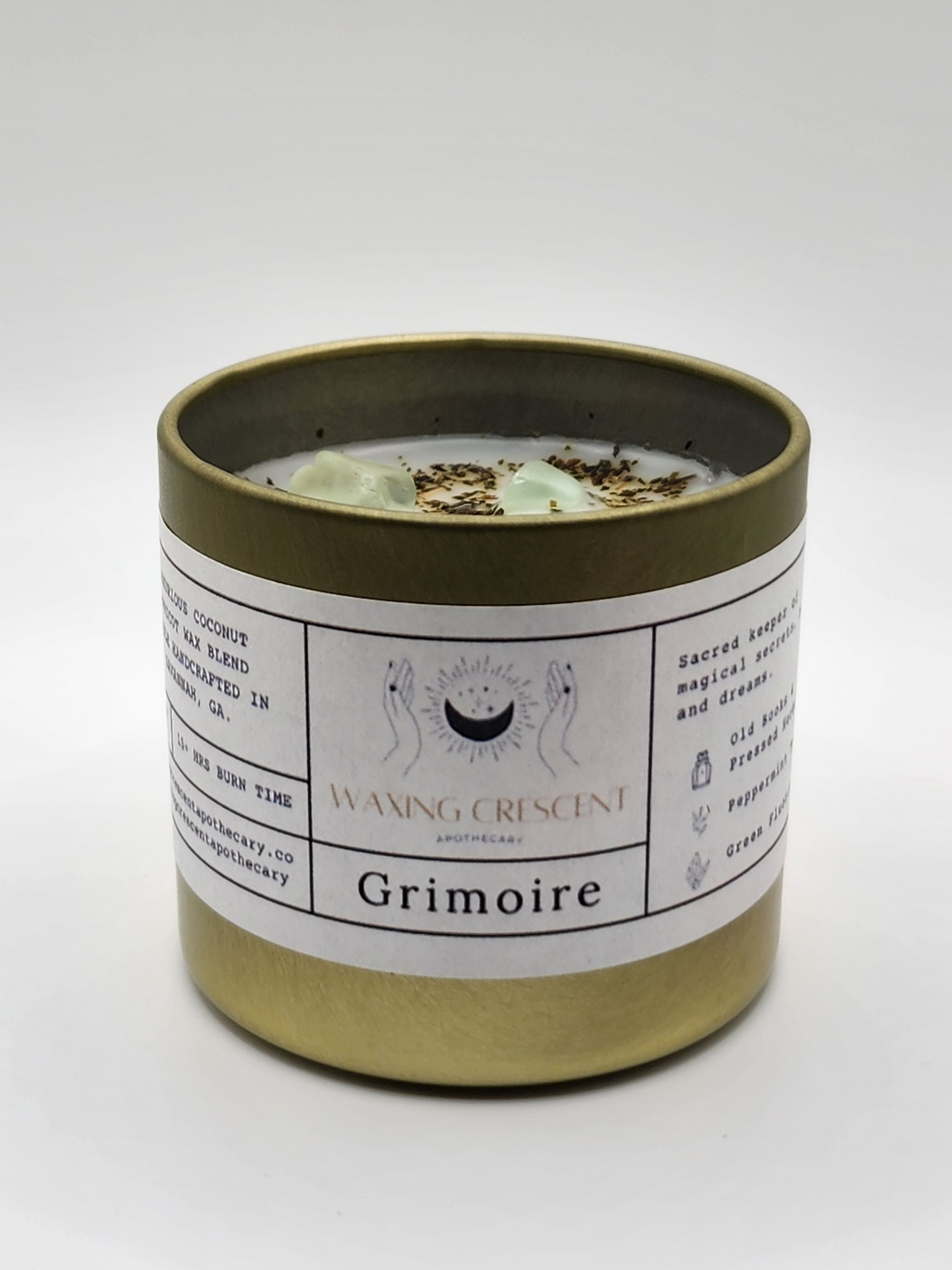 Topped with peppermint tea and green fluorite for memory and knowledge, this candle is the perfect talisman for late-night readings, spell-crafting, or pretending you're the main character in your own witchy novel.