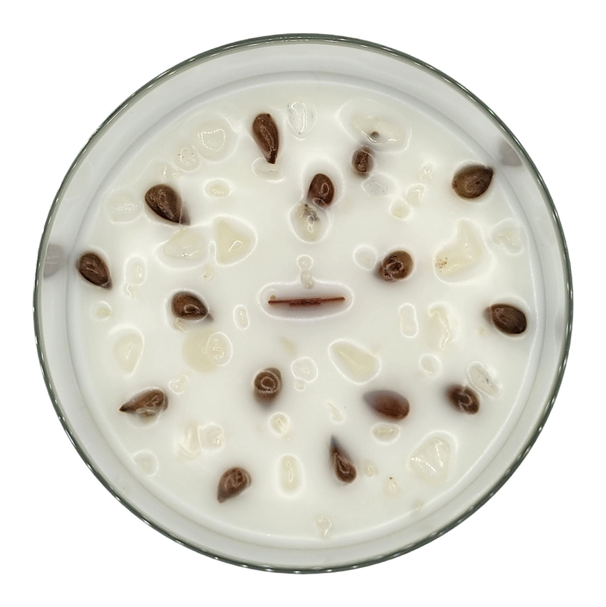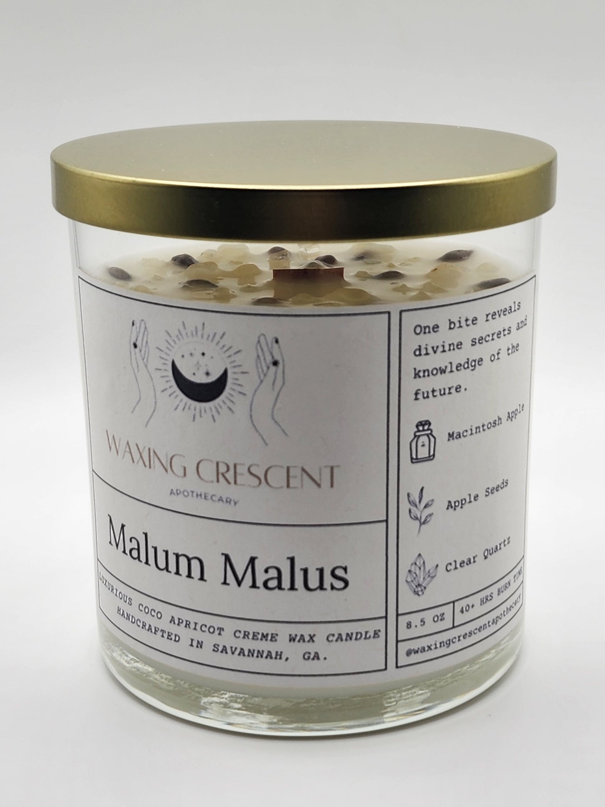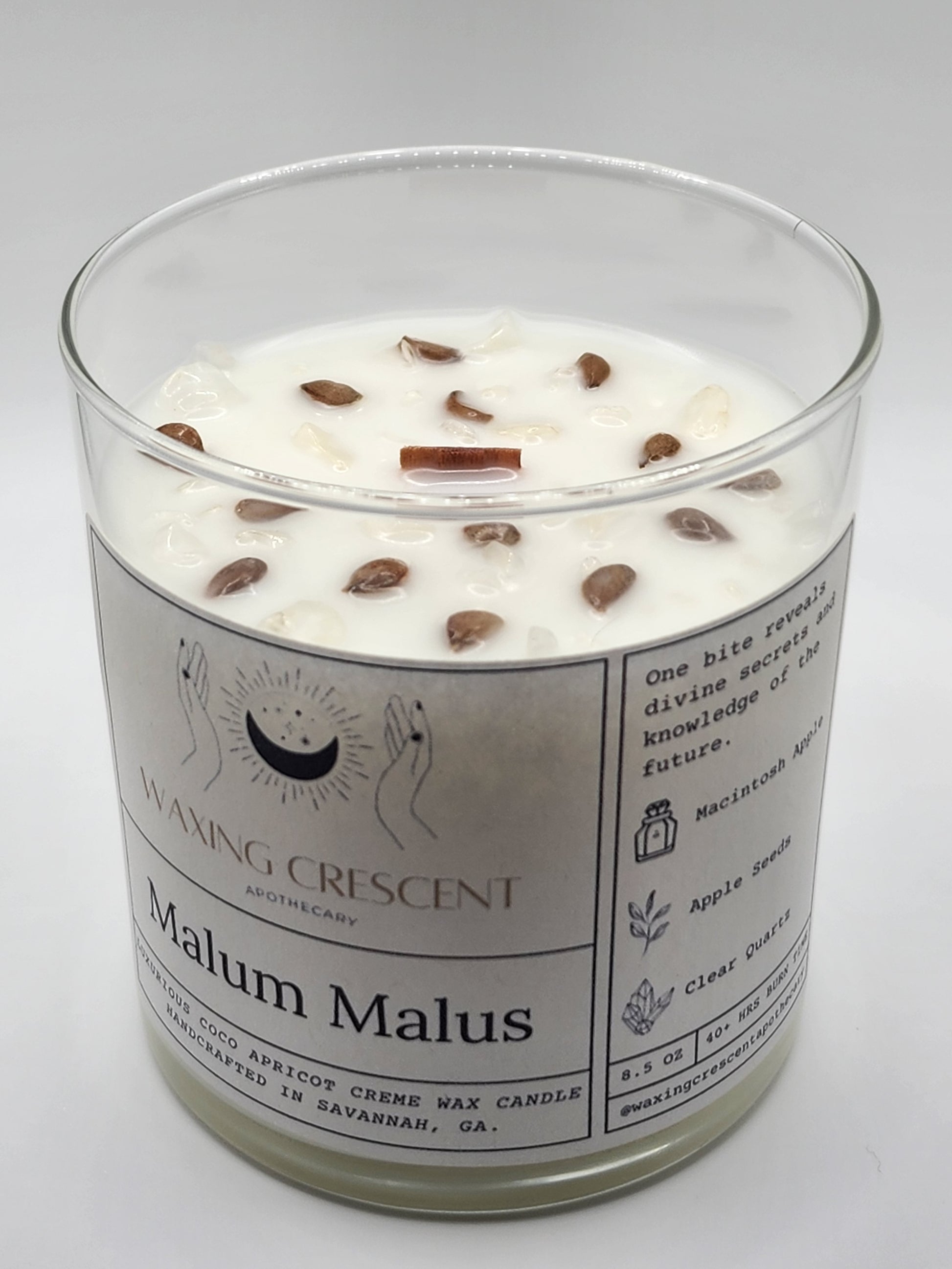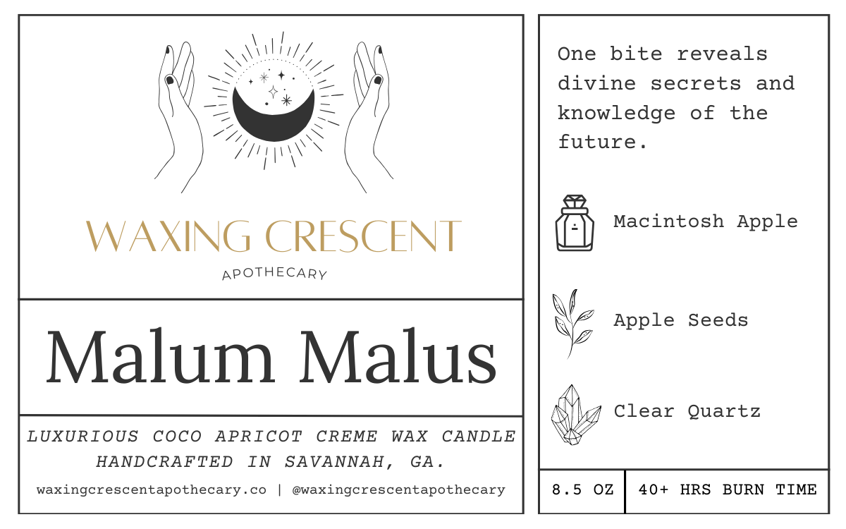 Inspired by the haunting first episode of Chilling Adventures of Sabrina, where she bites into the malum malus to glimpse her fate, this candle channels the same mystical energy of wisdom, temptation, and hidden truths. Its fragrance opens with crisp apple and fresh green leaves, brightened by the juicy sweetness of pear. Beneath, a warm base of vanilla and cedar lingers, grounding the fruity brightness with depth and quiet comfort. While this candle may not make you all-knowing, its enchanting aroma is crafted to clear the mind, ease stress, and open the door to insight. Adorned with apple seeds and clear quartz - both tied to divination and mental clarity - it beckons you to uncover the divine secrets within and illuminate the path ahead.