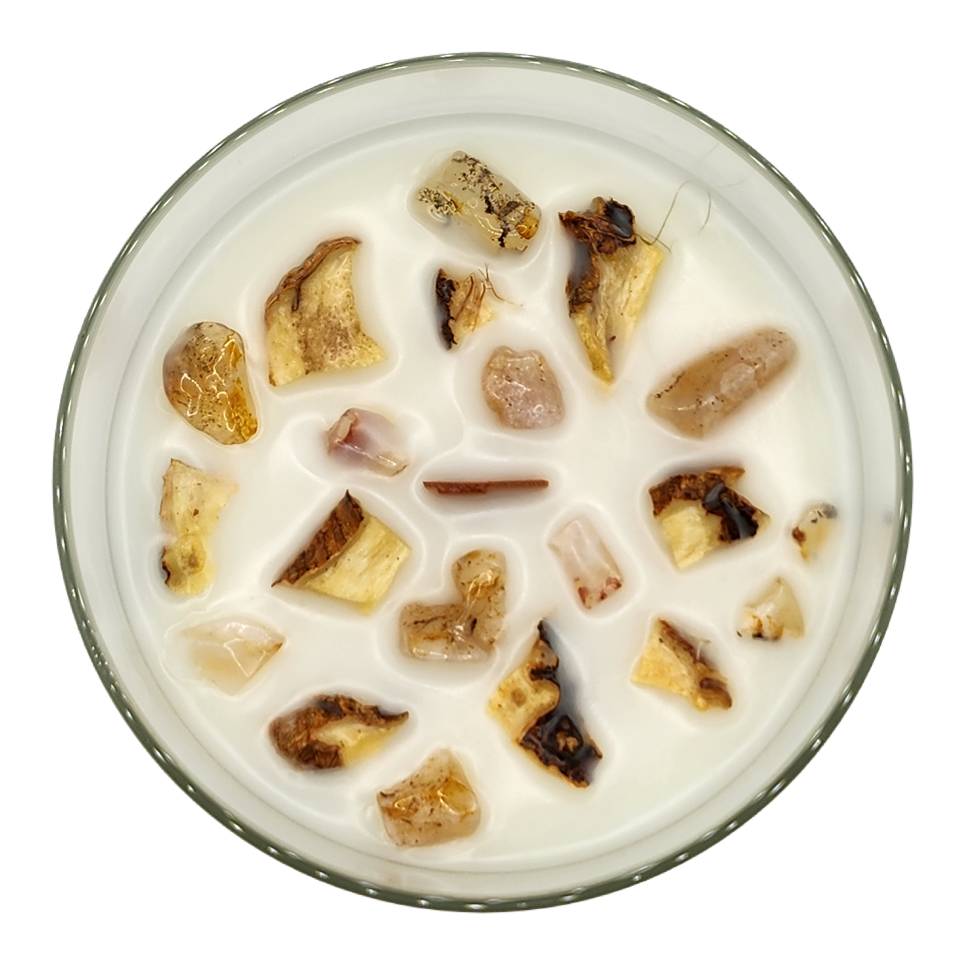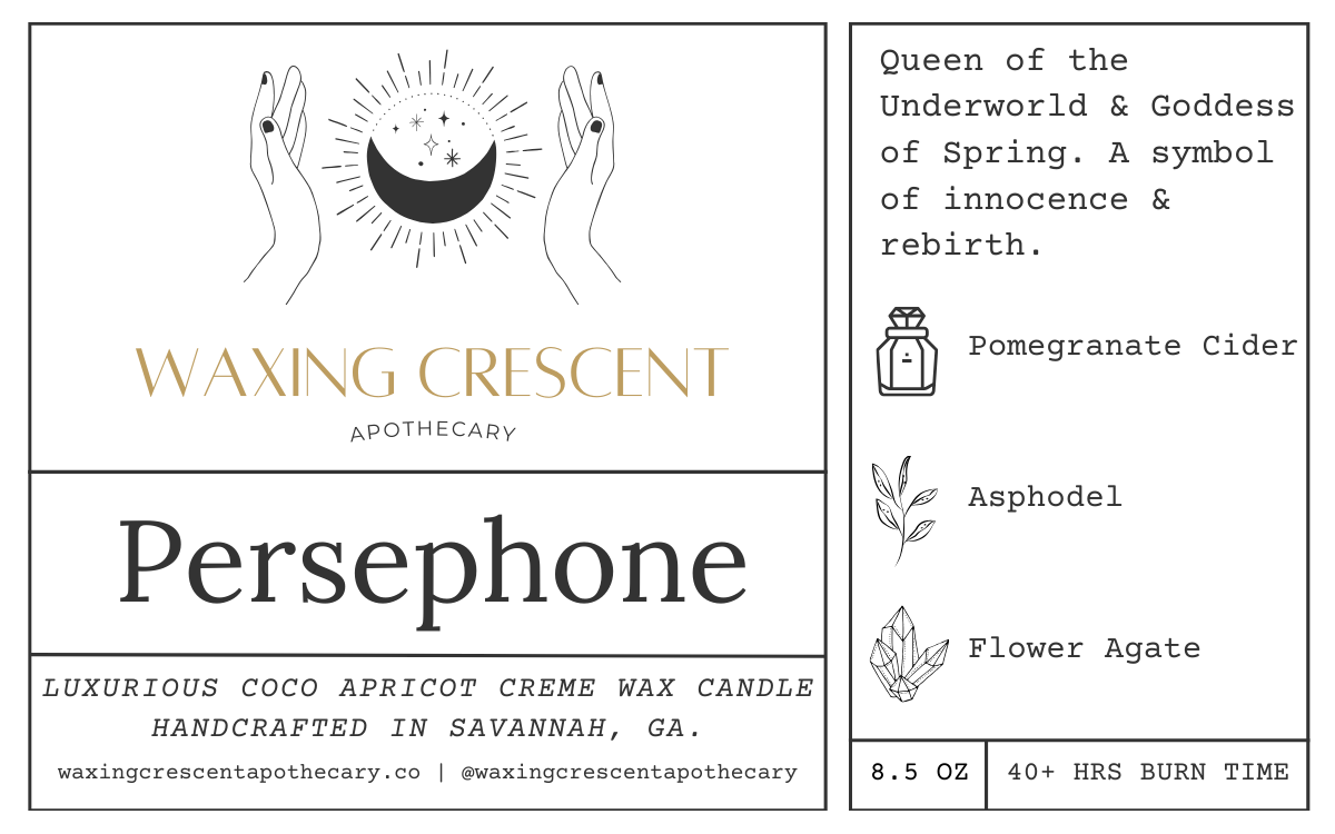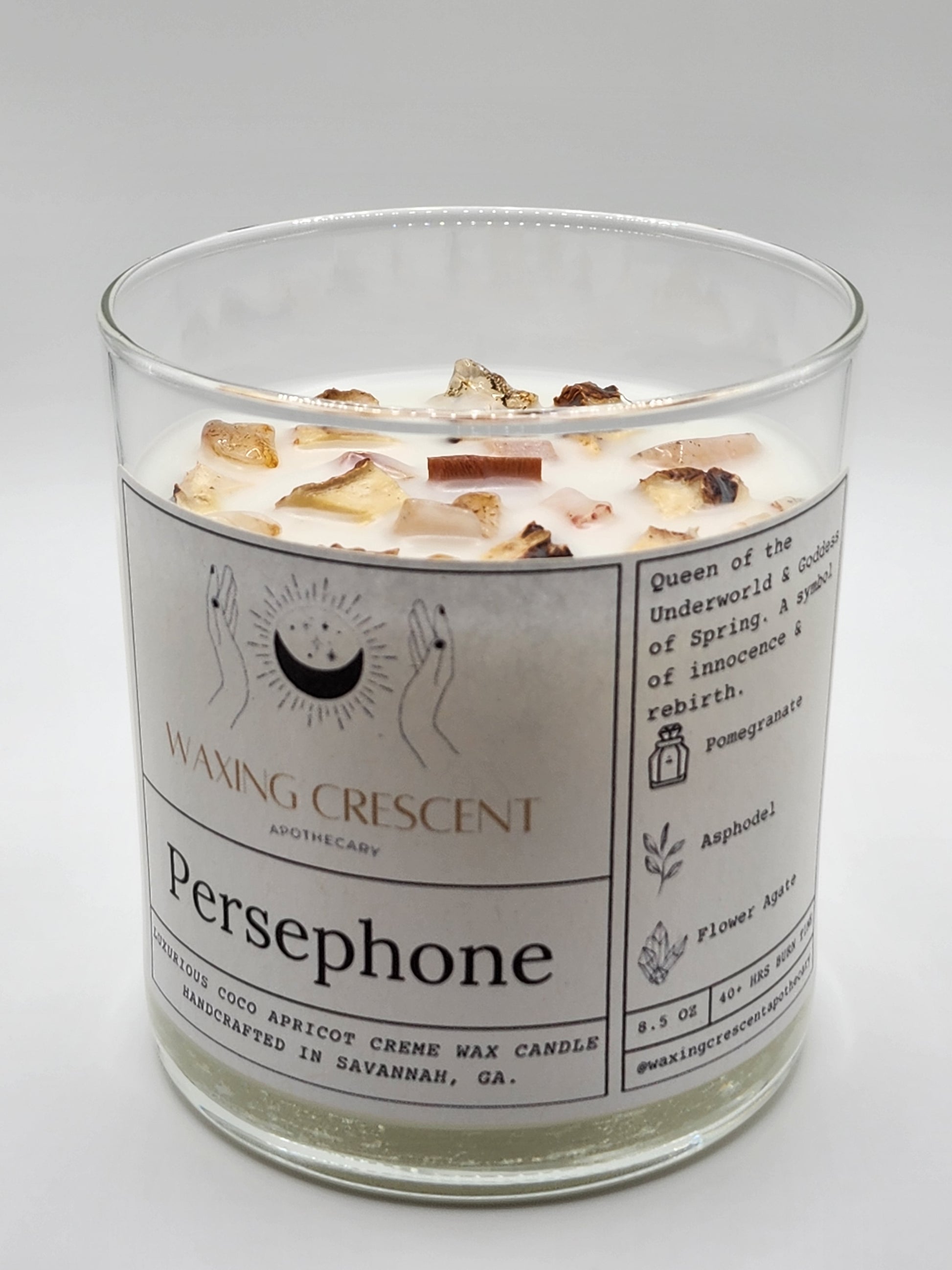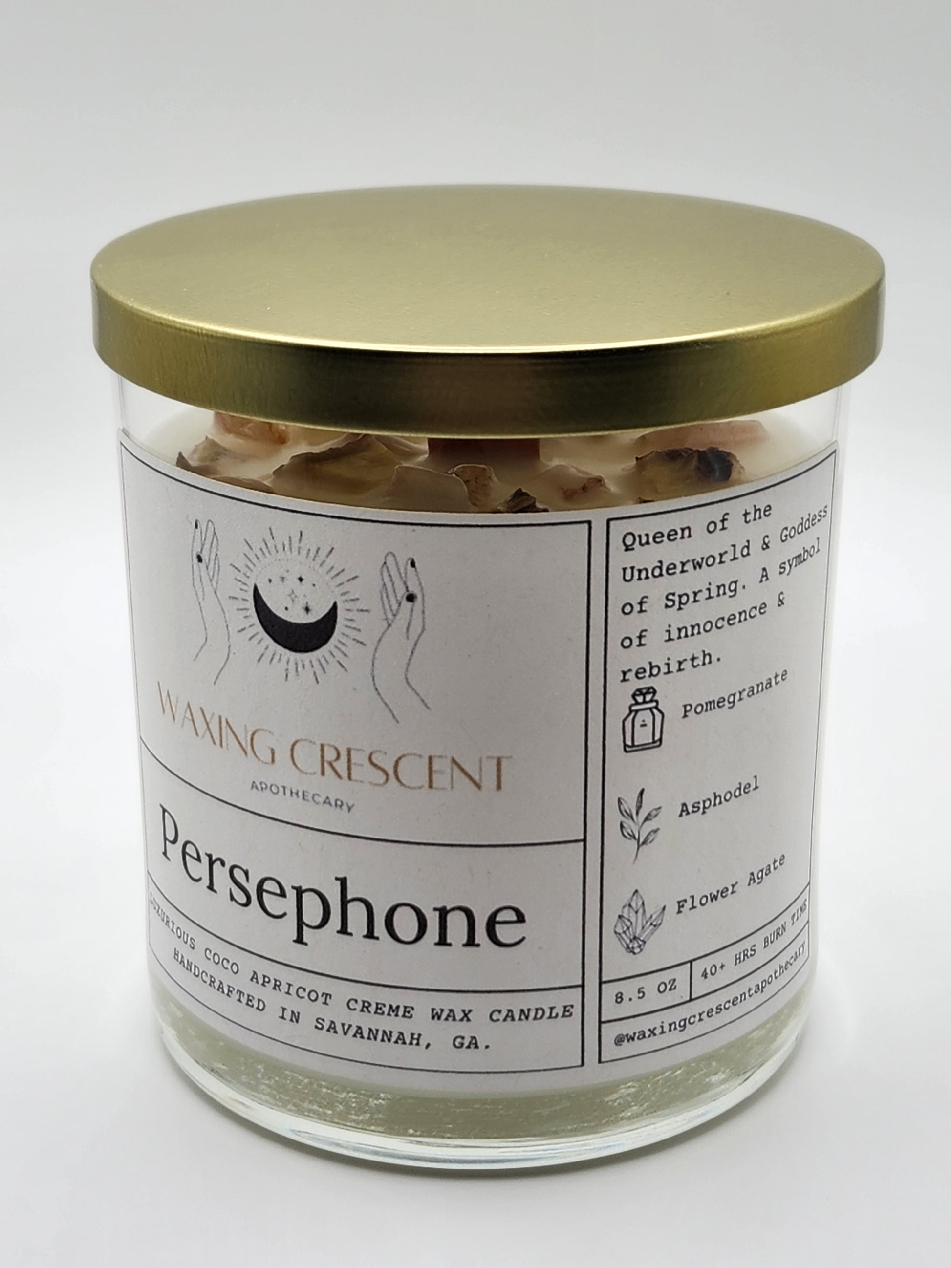 The pomegranate cider scent of this candle pays homage the story of Persephone both literally and symbolically. It is the fruit that Hades had her eat to ensure she would always return to him. It is also a fruit associated with fall and winter, when Persephone would be recalled to the Underworld. Far from dark and depressing, there is a brightness to the scent that gives it year-round appeal and speaks to Persephone's other badass title of Goddess of Spring. The sprinkling of asphodel, flower of the Underworld, represents life in death, and the flower agate helps with grounding, hopefulness, and blossoming into your full potential - just like Persephone.