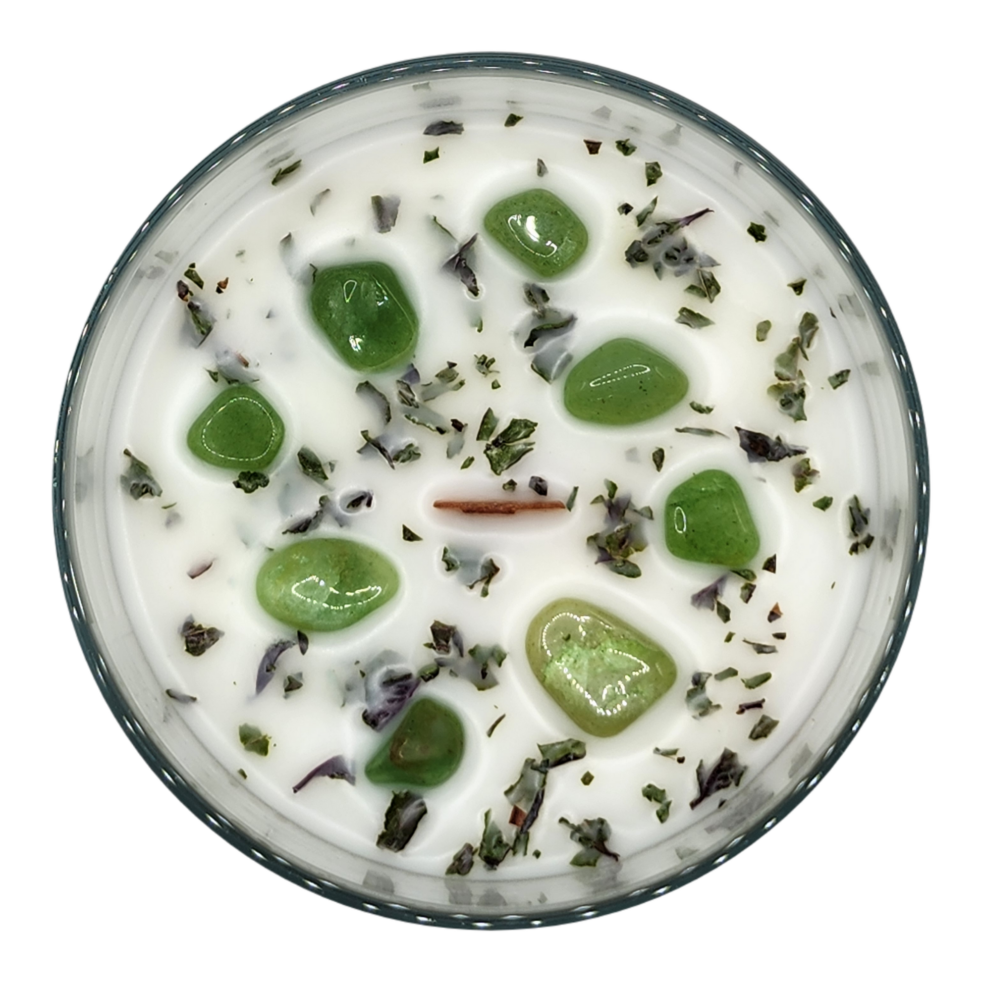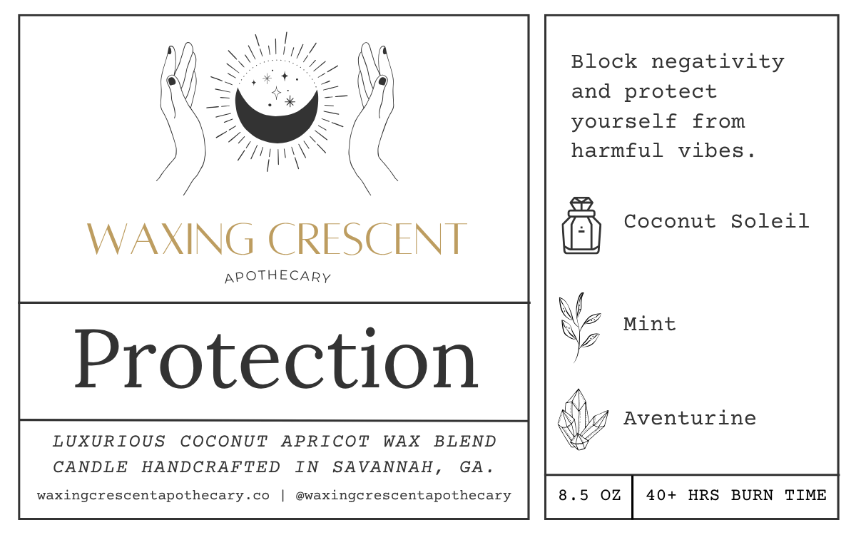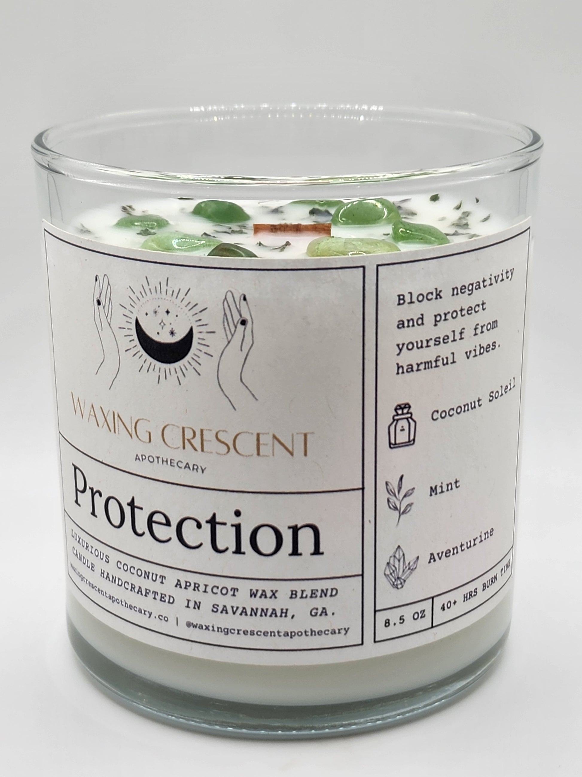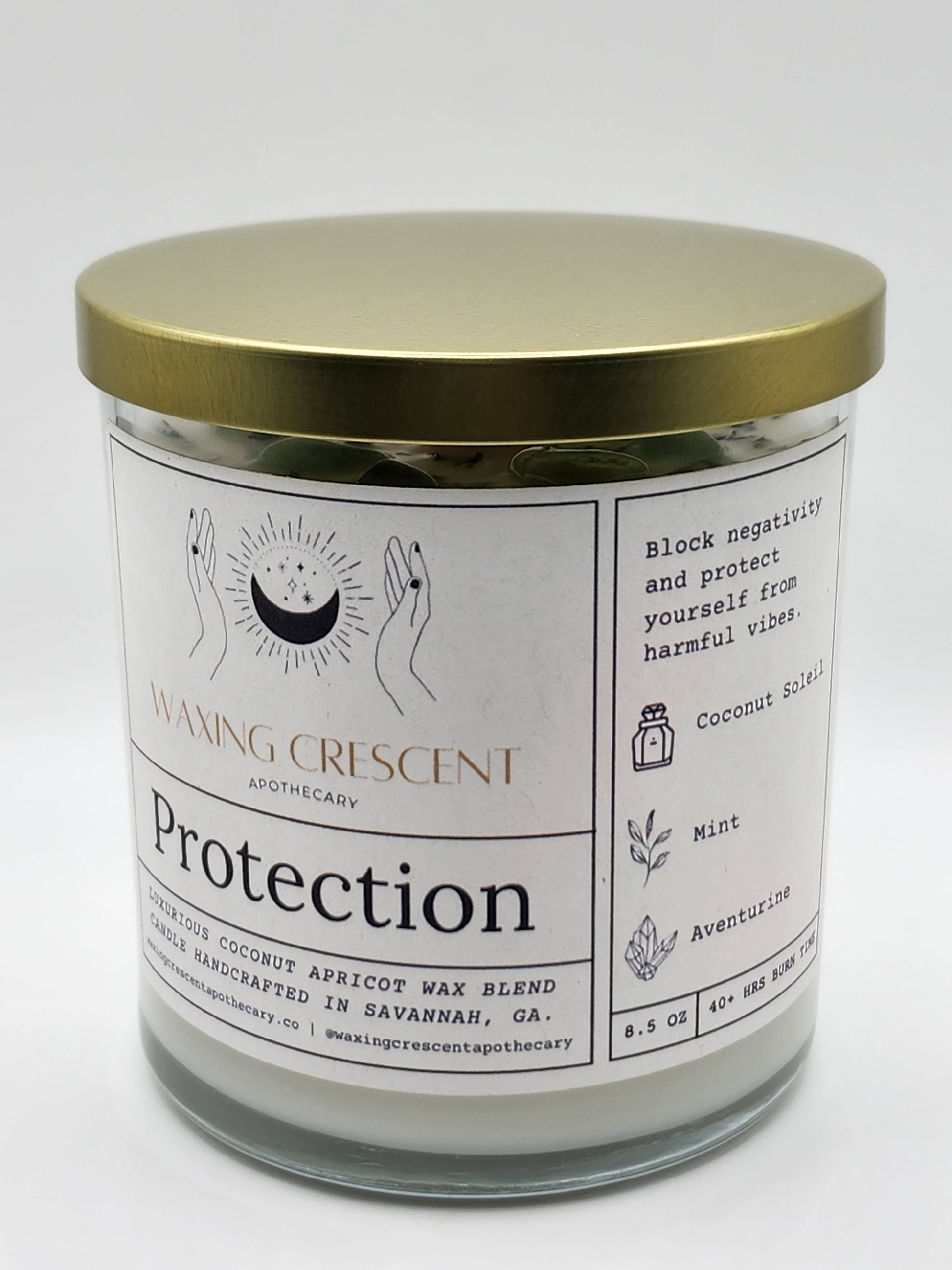 Block negative energies and protect yourself from harmful vibes with Protection! This playful, yet sophisticated tropical scent brings to mind the classic smell of coconut and banana sunscreen, making it the perfect scent for a protective candle. Coconut is seen by many cultures as a symbol of protection due to the fruit's hard outer shell, and is used in rituals for cleansing and purifying. The mint and aventurine on top also helps to ward off negativity and promote positivity.