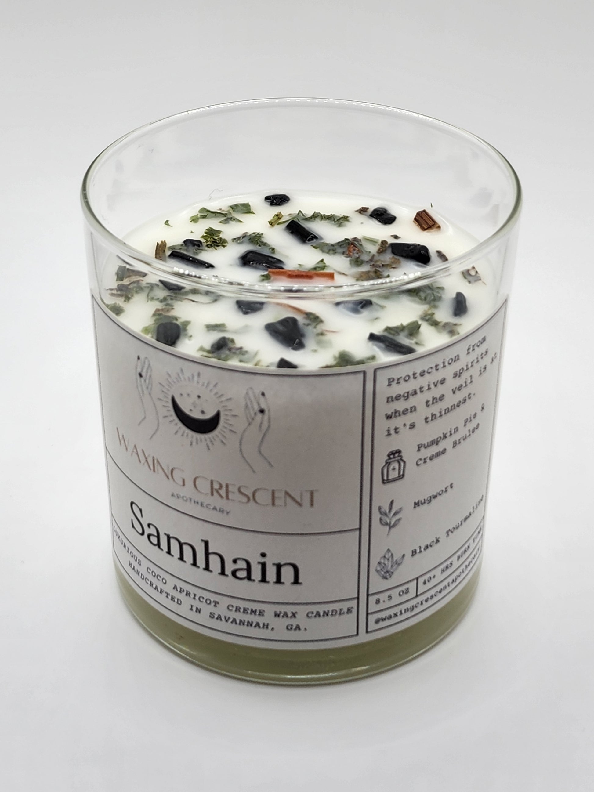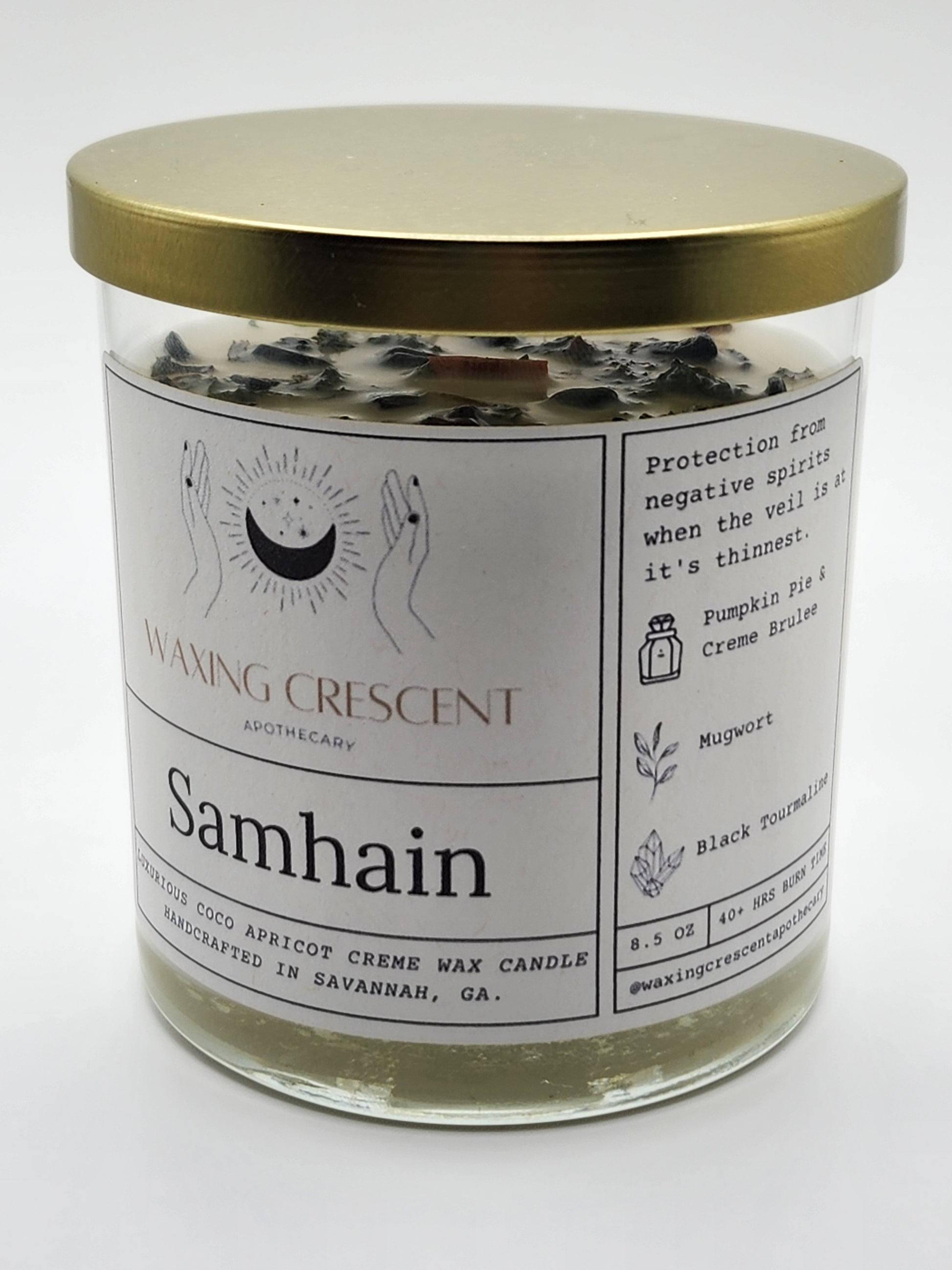 This candle embodies the essence of Samhain in a fragrance as rich and mysterious as the night itself. It opens with a warm medley of cinnamon, nutmeg, ginger, and cloves - spices that conjure hearth fires and festive feasts. At its heart lies creamy pumpkin folded into golden pie crust, laced with vanilla and caramelized sugar, evoking the comfort of ancestral kitchens. Hints of toasted coconut, buttery custard, and maple syrup swirl together with a decadent splash of dark rum, creating a lingering sweetness as smooth as velvet. Finally, a resinous undertone of benzoin grounds the blend, adding depth and a whisper of sacred smoke.