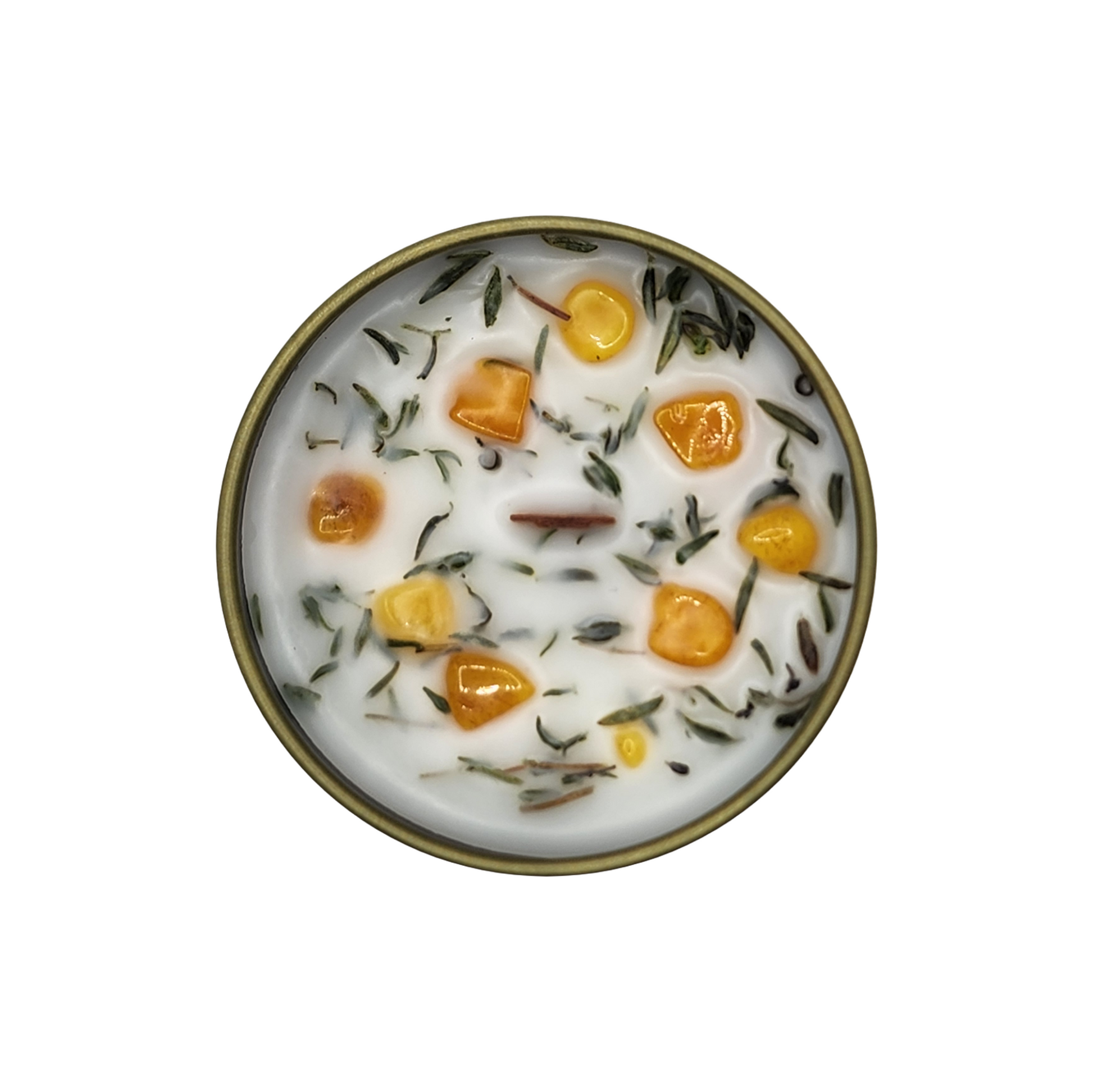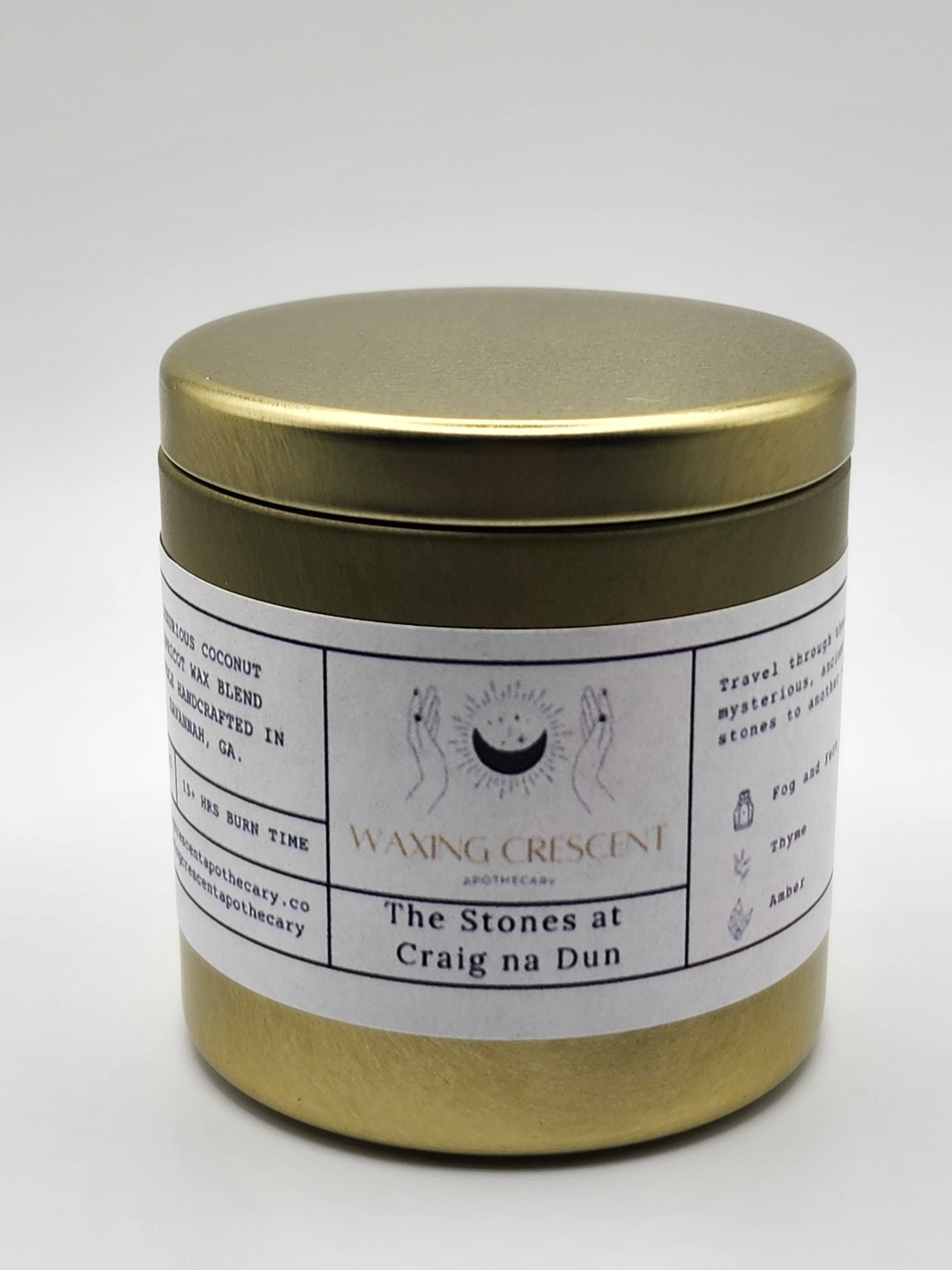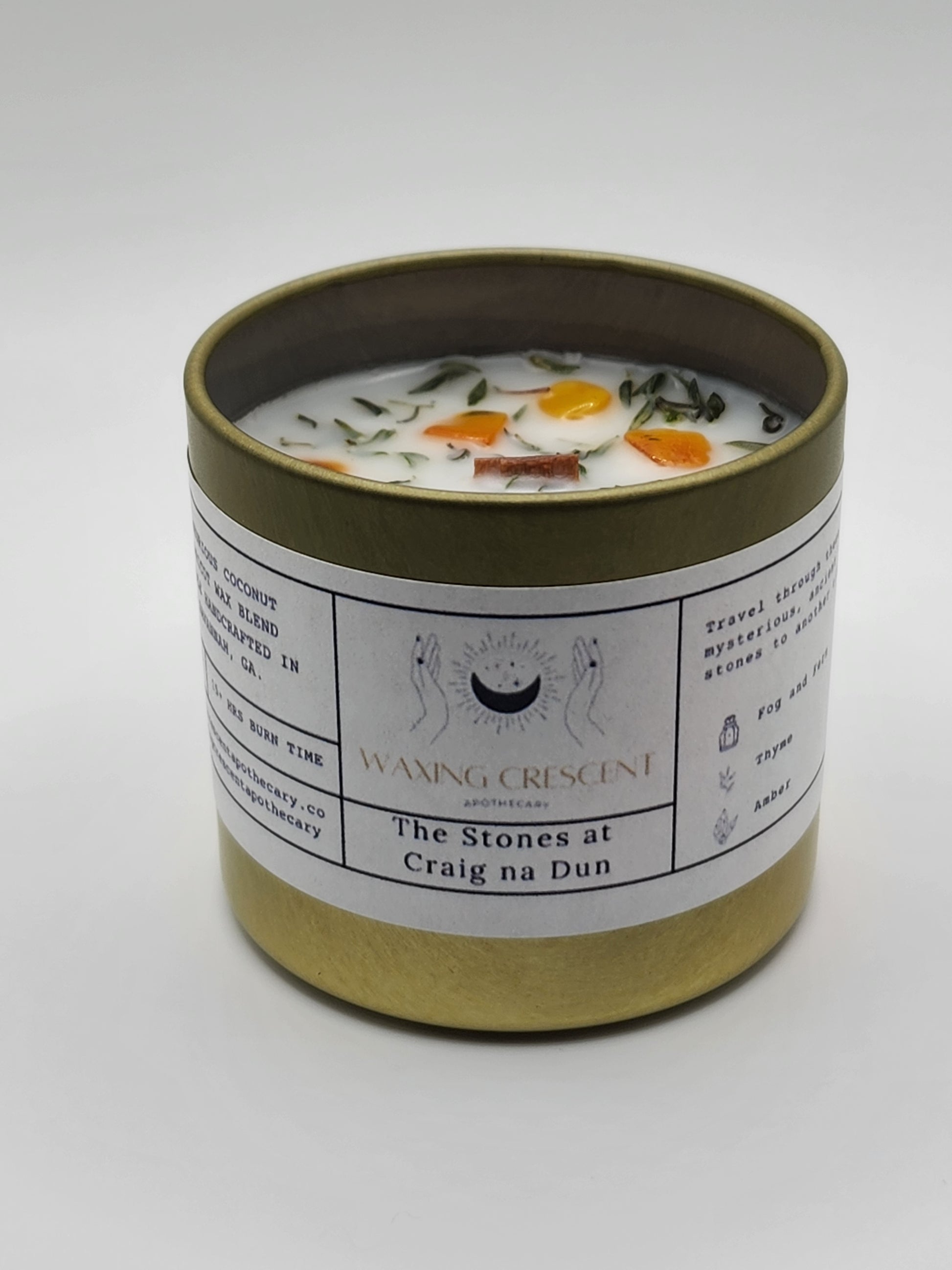 This candle is an homage to the Outlander book series and TV show. The scent is reminiscent of a lush, foggy woodland. It is fresh, clean, and invigorating, but grounded with hints of moss and earth. The sprinkle of thyme on top is a nod to the time travel that takes place throughout the story. Thyme is great for courage, protection, and healing, which Claire and Jamie are often in need of. The amber is a reference to the dragonfly preserved in amber that was given to Claire and Jamie as a wedding gift in the first book and the title of the second book. Amber also aids in protection and healing.