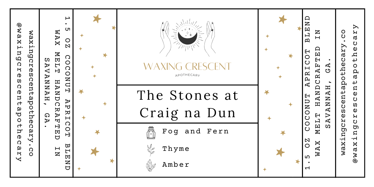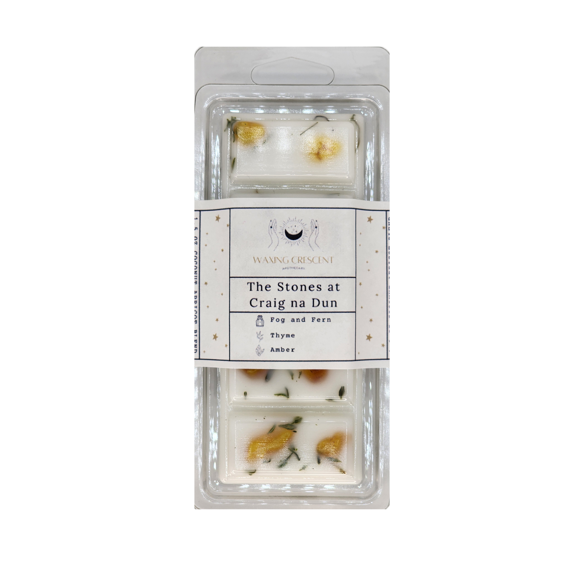This melt is an homage to the Outlander book series and TV show. The scent is reminiscent of a lush, foggy woodland. It is fresh, clean, and invigorating, but grounded with hints of moss and earth. The sprinkle of thyme on top is a nod to the time travel that takes place throughout the story. Thyme is great for courage, protection, and healing, which Claire and Jamie are often in need of. The amber is a reference to the dragonfly preserved in amber that was given to Claire and Jamie as a wedding gift in the first book and the title of the second book. Amber also aids in protection and healing.